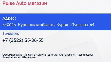 Pulse Auto, магазин по адресу 640026, Курганская область, Курган, Пушкина, 64 в дальнейшем Организация, размещена в следующих категориях: