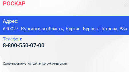 РОСКАР по адресу 640027, Курганская область, Курган, Бурова-Петрова, 98а в дальнейшем Организация, размещена в следующих категориях: