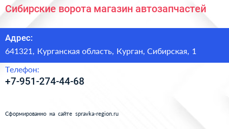 Сибирские ворота, магазин автозапчастей по адресу 641321, Курганская область, Курган, Сибирская, 1 в дальнейшем Организация, размещена в следующих категориях: