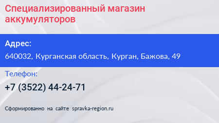 Специализированный магазин аккумуляторов по адресу 640032, Курганская область, Курган, Бажова, 49 в дальнейшем Организация, размещена в следующих категориях: