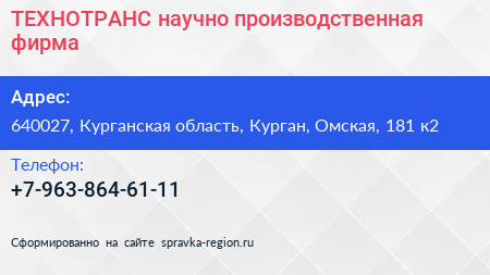 ТЕХНОТРАНС, научно-производственная фирма по адресу 640027, Курганская область, Курган, Омская, 181 к2 в дальнейшем Организация, размещена в следующих категориях: