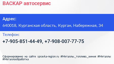 ВАСКАР, автосервис по адресу 640018, Курганская область, Курган, Набережная, 34 в дальнейшем Организация, размещена в следующих категориях: