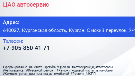 ЦАО, автосервис по адресу 640027, Курганская область, Курган, Омский переулок, 9/4 в дальнейшем Организация, размещена в следующих категориях: