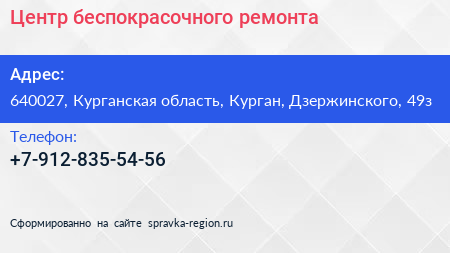 Центр беспокрасочного ремонта по адресу 640027, Курганская область, Курган, Дзержинского, 49з в дальнейшем Организация, размещена в следующих категориях: