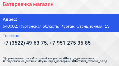 Батареечка, магазин по адресу 640002, Курганская область, Курган, Станционная, 13 в дальнейшем Организация, размещена в следующих категориях:
