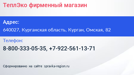 ТеплЭко, фирменный магазин по адресу 640027, Курганская область, Курган, Омская, 82 в дальнейшем Организация, размещена в следующих категориях: