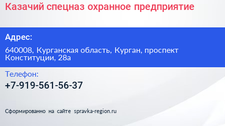 Казачий спецназ, охранное предприятие по адресу 640008, Курганская область, Курган, проспект Конституции, 28а в дальнейшем Организация, размещена в следующих категориях: