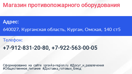 Магазин противопожарного оборудования по адресу 640027, Курганская область, Курган, Омская, 140 ст5 в дальнейшем Организация, размещена в следующих категориях: