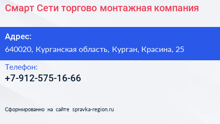 Смарт Сети, торгово-монтажная компания по адресу 640020, Курганская область, Курган, Красина, 25 в дальнейшем Организация, размещена в следующих категориях: