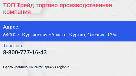 ТОП-Трейд, торгово-производственная компания по адресу 640027, Курганская область, Курган, Омская, 135а в дальнейшем Организация, размещена в следующих категориях: