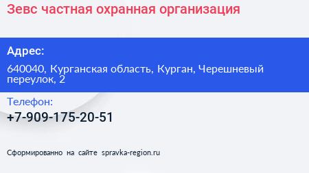 Зевс, частная охранная организация по адресу 640040, Курганская область, Курган, Черешневый переулок, 2 в дальнейшем Организация, размещена в следующих категориях: