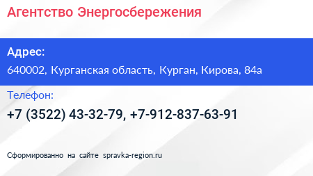 Агентство Энергосбережения по адресу 640002, Курганская область, Курган, Кирова, 84а в дальнейшем Организация, размещена в следующих категориях:
