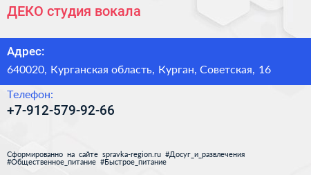 ДЕКО, студия вокала по адресу 640020, Курганская область, Курган, Советская, 16 в дальнейшем Организация, размещена в следующих категориях: