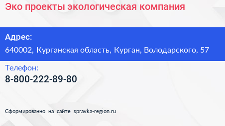 Эко-проекты, экологическая компания по адресу 640002, Курганская область, Курган, Володарского, 57 в дальнейшем Организация, размещена в следующих категориях: