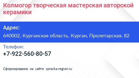 Колмогор, творческая мастерская авторской керамики по адресу 640002, Курганская область, Курган, Пролетарская, 82 в дальнейшем Организация, размещена в следующих категориях: