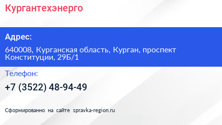 Кургантехэнерго по адресу 640008, Курганская область, Курган, проспект Конституции, 29Б/1 в дальнейшем Организация, размещена в следующих категориях: