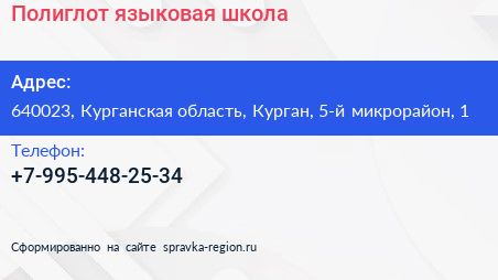 Полиглот, языковая школа по адресу 640023, Курганская область, Курган, 5-й микрорайон, 1 в дальнейшем Организация, размещена в следующих категориях: