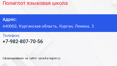 Полиглот, языковая школа по адресу 640002, Курганская область, Курган, Ленина, 5 в дальнейшем Организация, размещена в следующих категориях: