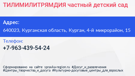 ТИЛИМИЛИТРЯМДИЯ, частный детский сад по адресу 640023, Курганская область, Курган, 4-й микрорайон, 15 в дальнейшем Организация, размещена в следующих категориях: