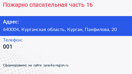 Пожарно-спасательная часть №16 по адресу 640004, Курганская область, Курган, Панфилова, 20 в дальнейшем Организация, размещена в следующих категориях: