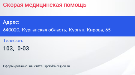 Скорая медицинская помощь по адресу 640020, Курганская область, Курган, Кирова, 65 в дальнейшем Организация, размещена в следующих категориях:
