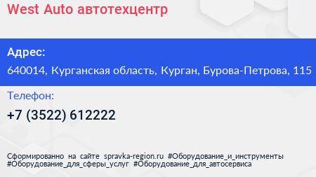 West Auto, автотехцентр по адресу 640014, Курганская область, Курган, Бурова-Петрова, 115 в дальнейшем Организация, размещена в следующих категориях: