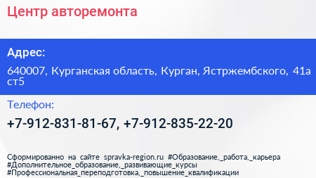 Центр авторемонта по адресу 640007, Курганская область, Курган, Ястржембского, 41а ст5 в дальнейшем Организация, размещена в следующих категориях: