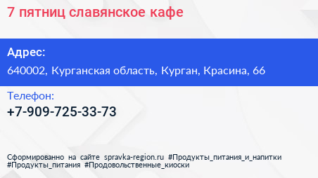 7 пятниц, славянское кафе по адресу 640002, Курганская область, Курган, Красина, 66 в дальнейшем Организация, размещена в следующих категориях: