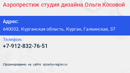 Аэропрестиж студия дизайна Ольги Косовой по адресу 640032, Курганская область, Курган, Галкинская, 37 в дальнейшем Организация, размещена в следующих категориях: