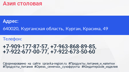 Азия, столовая по адресу 640020, Курганская область, Курган, Красина, 49 в дальнейшем Организация, размещена в следующих категориях: