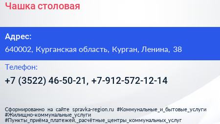 Чашка, столовая по адресу 640002, Курганская область, Курган, Ленина, 38 в дальнейшем Организация, размещена в следующих категориях: