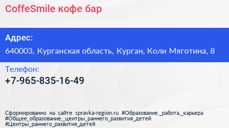 CoffeSmile, кофе-бар по адресу 640003, Курганская область, Курган, Коли Мяготина, 8 в дальнейшем Организация, размещена в следующих категориях: