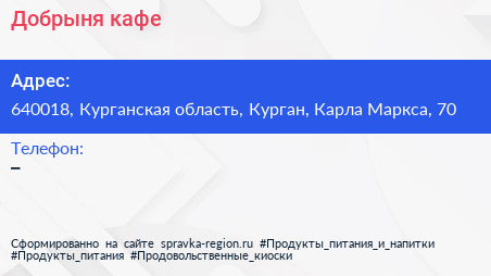 Добрыня, кафе по адресу 640018, Курганская область, Курган, Карла Маркса, 70 в дальнейшем Организация, размещена в следующих категориях: