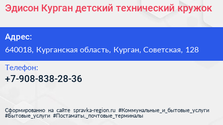 Эдисон-Курган, детский технический кружок по адресу 640018, Курганская область, Курган, Советская, 128 в дальнейшем Организация, размещена в следующих категориях: