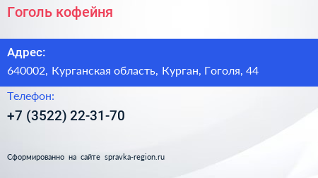 Гоголь, кофейня по адресу 640002, Курганская область, Курган, Гоголя, 44 в дальнейшем Организация, размещена в следующих категориях: