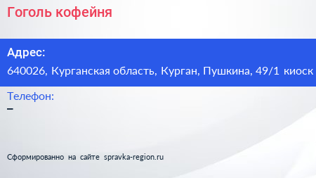 Гоголь, кофейня по адресу 640026, Курганская область, Курган, Пушкина, 49/1 киоск в дальнейшем Организация, размещена в следующих категориях: