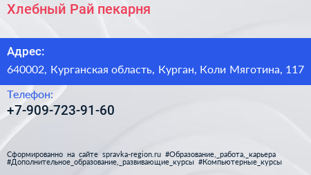 Хлебный Рай, пекарня по адресу 640002, Курганская область, Курган, Коли Мяготина, 117 в дальнейшем Организация, размещена в следующих категориях: