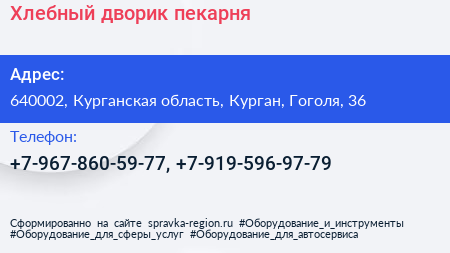 Хлебный дворик, пекарня по адресу 640002, Курганская область, Курган, Гоголя, 36 в дальнейшем Организация, размещена в следующих категориях: