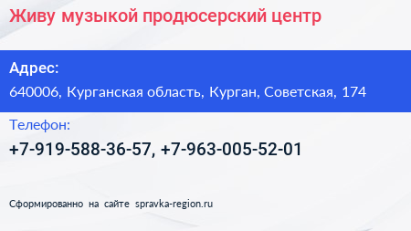 Живу музыкой, продюсерский центр по адресу 640006, Курганская область, Курган, Советская, 174 в дальнейшем Организация, размещена в следующих категориях: