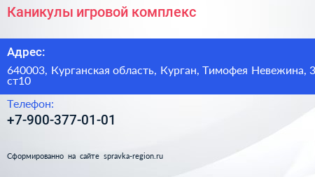 Каникулы, игровой комплекс по адресу 640003, Курганская область, Курган, Тимофея Невежина, 3 ст10 в дальнейшем Организация, размещена в следующих категориях: