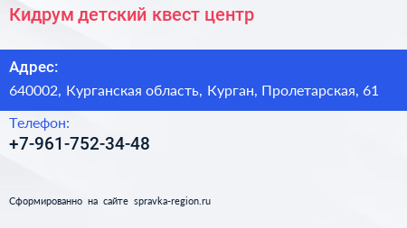 Кидрум, детский квест-центр по адресу 640002, Курганская область, Курган, Пролетарская, 61 в дальнейшем Организация, размещена в следующих категориях: