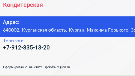 Кондитерская по адресу 640002, Курганская область, Курган, Максима Горького, 36 в дальнейшем Организация, размещена в следующих категориях: