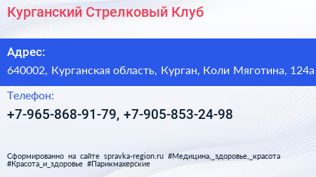 Курганский Стрелковый Клуб по адресу 640002, Курганская область, Курган, Коли Мяготина, 124а в дальнейшем Организация, размещена в следующих категориях: