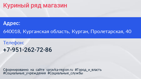 Куриный ряд, магазин по адресу 640018, Курганская область, Курган, Пролетарская, 40 в дальнейшем Организация, размещена в следующих категориях:
