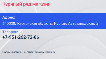 Куриный ряд, магазин по адресу 640008, Курганская область, Курган, Автозаводская, 5 в дальнейшем Организация, размещена в следующих категориях: