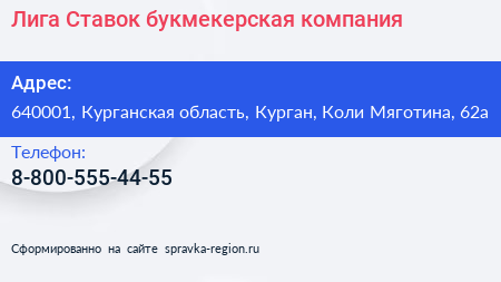 Лига Ставок, букмекерская компания по адресу 640001, Курганская область, Курган, Коли Мяготина, 62а в дальнейшем Организация, размещена в следующих категориях: