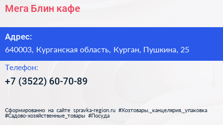 Мега Блин, кафе по адресу 640003, Курганская область, Курган, Пушкина, 25 в дальнейшем Организация, размещена в следующих категориях: