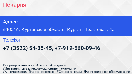 Пекарня по адресу 640016, Курганская область, Курган, Трактовая, 4а в дальнейшем Организация, размещена в следующих категориях: