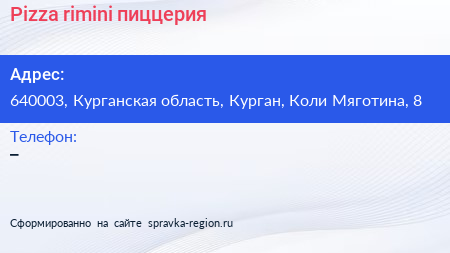 Pizza rimini, пиццерия по адресу 640003, Курганская область, Курган, Коли Мяготина, 8 в дальнейшем Организация, размещена в следующих категориях: