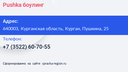 Pushka, боулинг по адресу 640003, Курганская область, Курган, Пушкина, 25 в дальнейшем Организация, размещена в следующих категориях: